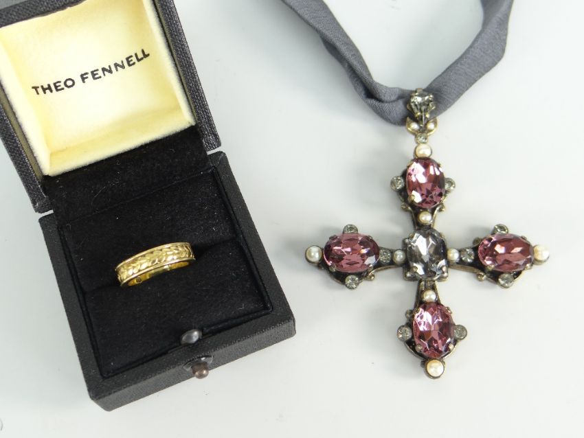 18CT LEAF DESIGN WEDDING BAND in Theo Fennell box, 5.4gms, together with crucifix pendant