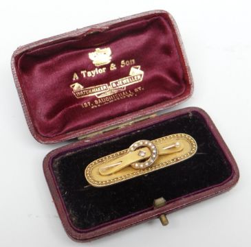 15CT GOLD SEED PEARL BUCKLE DESIGN BAR BROOCH, 7gms, in box