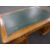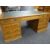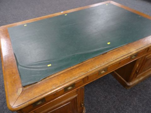LARGE TURN OF THE CENTURY OAK PARTNERS DESK having two opposing banks of eight drawers, green leather work surface, furnished with campaign-style brass handles and escutcheons, 120cms deep x 180cms wide