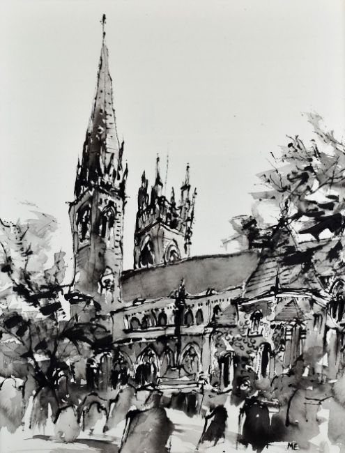 MARK EDWARDS ink on paper - view towards Llandaff Cathedral from the South West, signed, 60 x 47cms