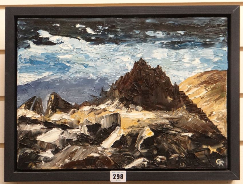 GWYN ROBERTS oil on canvas - North Wales mountain peak with dark sky in background, signed with initials, 30 x 41cms
