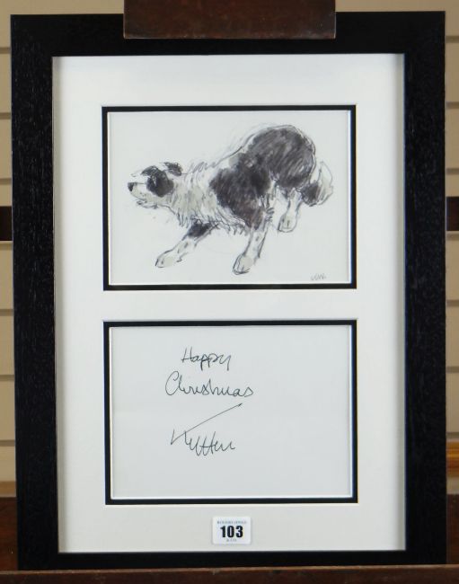 SIR KYFFIN WILLIAMS RA signed Christmas card and print - print of sheep dog, framed together with a separate greeting 'Happy Christmas' and signed 'Kyffin', 14 x 19cms each