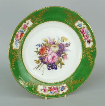 NANTGARW PORCELAIN PLATE having apple-green border reserved with three panels containing flower sprays in gilt work floral and scroll frames, the interior with a large spray of wild-flowers, impressed mark NANT GARW CW to base,