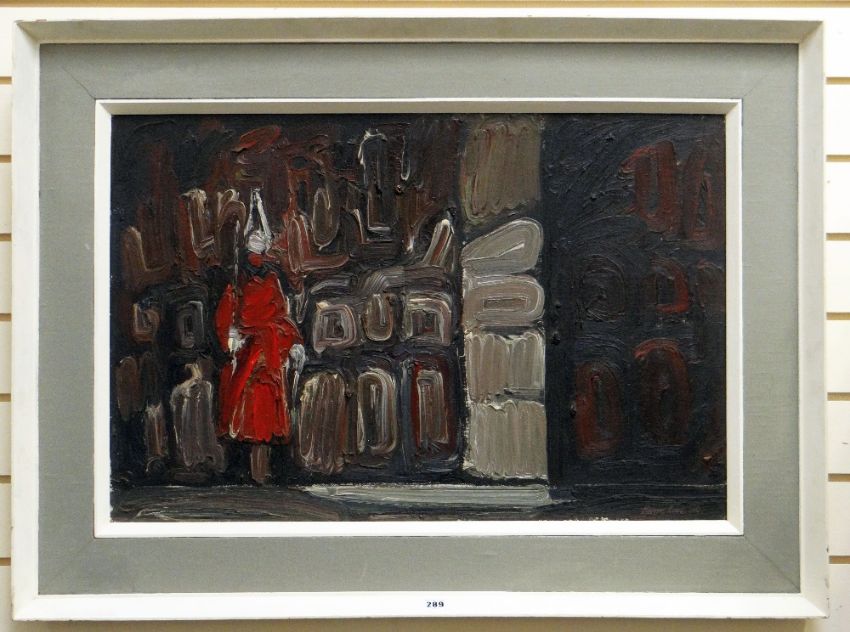 MERVYN ROWE oil on board - standing figure in red Horse Guards coat with sword and helmet, signed and dated 1962, 48 x 74cms