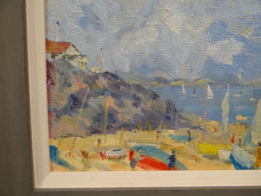 CHARLES WYATT WARREN oil on board - busy and bright beach scene, entitled 'Abersoch Beach with South Caernarfon Yacht Club in View', signed, 40 x 49cms