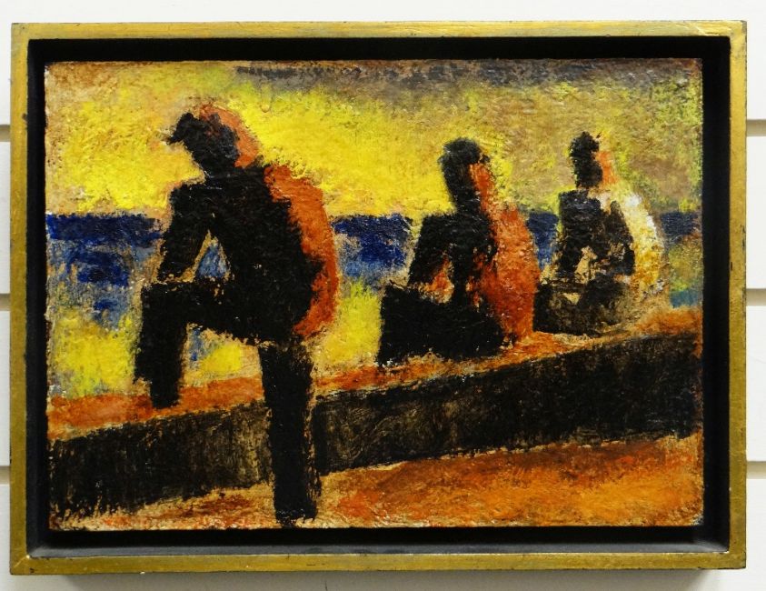 JOSEF HERMAN oil on board - three figures at a seawall, entitled verso on Boundary Gallery label 'Evening at Dunwich', dated 1985, 25 x 36cms