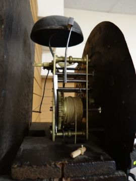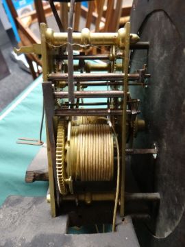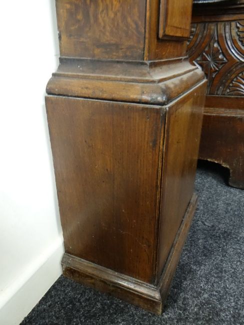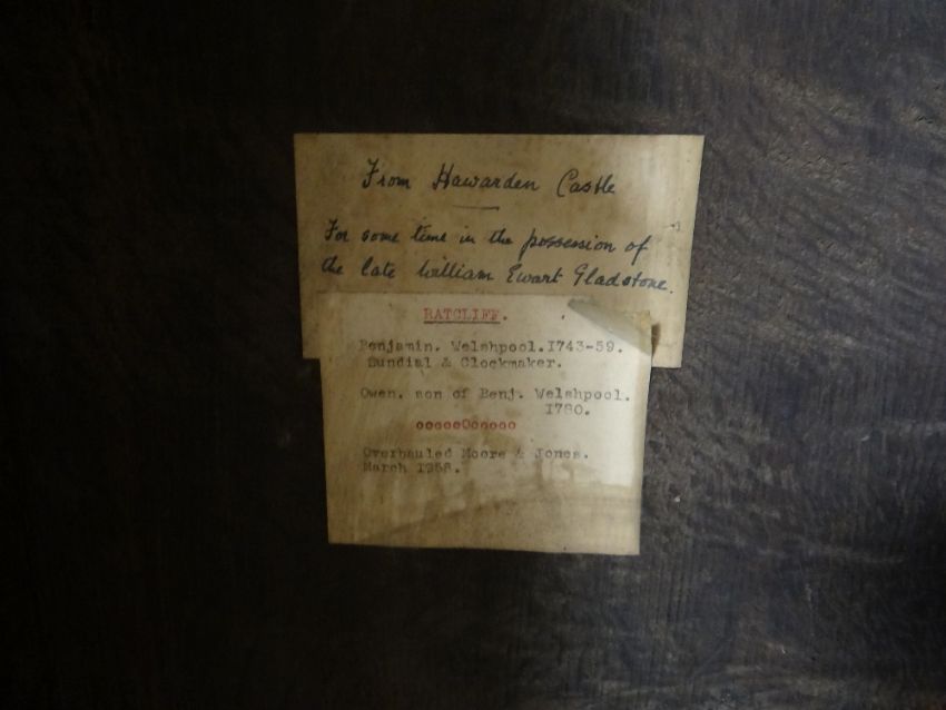 RARE WELSH LONGCASE CLOCK BY BENJAMIN RATCLIFF, WELSHPOOL eight-day movement, oak encased with unusual brass solar dial bearing Roman numerals and maker's name, elegant narrow crossbanded trunk, carved frieze to hood, 213cms high Provenance: Owned by William Ewart Gladstone at Hawarden Castle, old label to interiorThe clock case has some general wear, light scratches and a few small chips to corners.The tab at the top of the pendulum has broken.All the glass is good