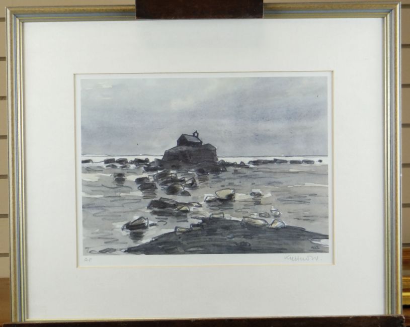 SIR KYFFIN WILLIAMS RA artist's proof coloured print - St Cwyfan's church, signed, 26 x 35cms (mounted and framed)