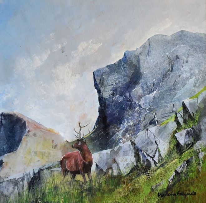 MALCOLM EDWARDS watercolour and mixed media - stag in a mountainous landscape, entitled verso 'Pearly Sky, Laxford Bridge', signed, 27.5 x 26.5cms