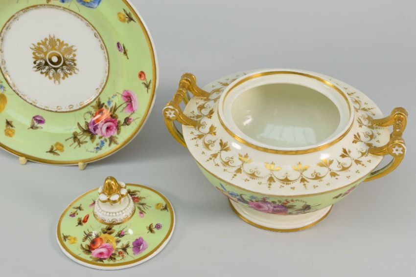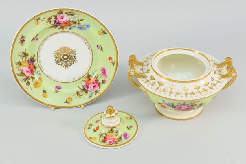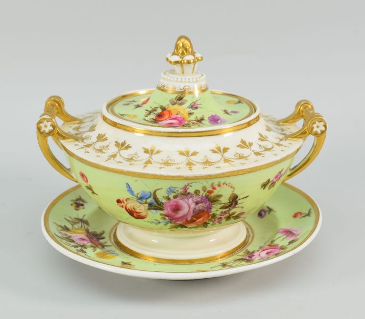 SWANSEA PORCELAIN TUREEN, COVER & STAND the domed cover with pineapple finial, the base with tapering pedestal body and spindle handles, decorated with gilding and sprays of flowers in lime-green surround, Harry Sherman collecting label to base, 13cms high, stand 19cms diam: not damaged or restored on either stand / tureen or cover, gilding wear particularly to centre of stand where tureen sits and to handles. One peculiarity is that the ‘dowel’ within one of the loop handles has deep gilding loss at the join areas but I cannot see how this has been restored – I just think it is a ‘peculiarity’