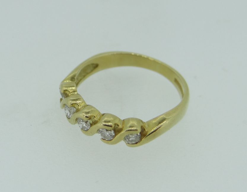 18CT YELLOW GOLD FIVE STONE DIAMOND WAVE DESIGN RING, 3.7 grams.