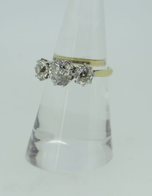 18CT YELLOW GOLD AND PLATINUM THREE STONE DIAMOND RING, the three stones approximately 1.5cts overall, 3.6 grams.