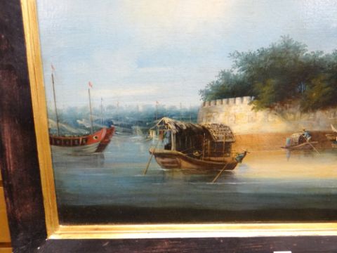 NINETEENTH CENTURY CANTON EXPORT SCHOOL oil on canvas, a pair - Pearl River fort with boats and figures / Hong Kong river scene with jetty, buildings, boats and figures, 46 x 59cmsThere is paint cracking on both especially in the sky areas.There are a couple of very small spots of paint loss on the first picture.Both frames show signs of wear especially to the corners.