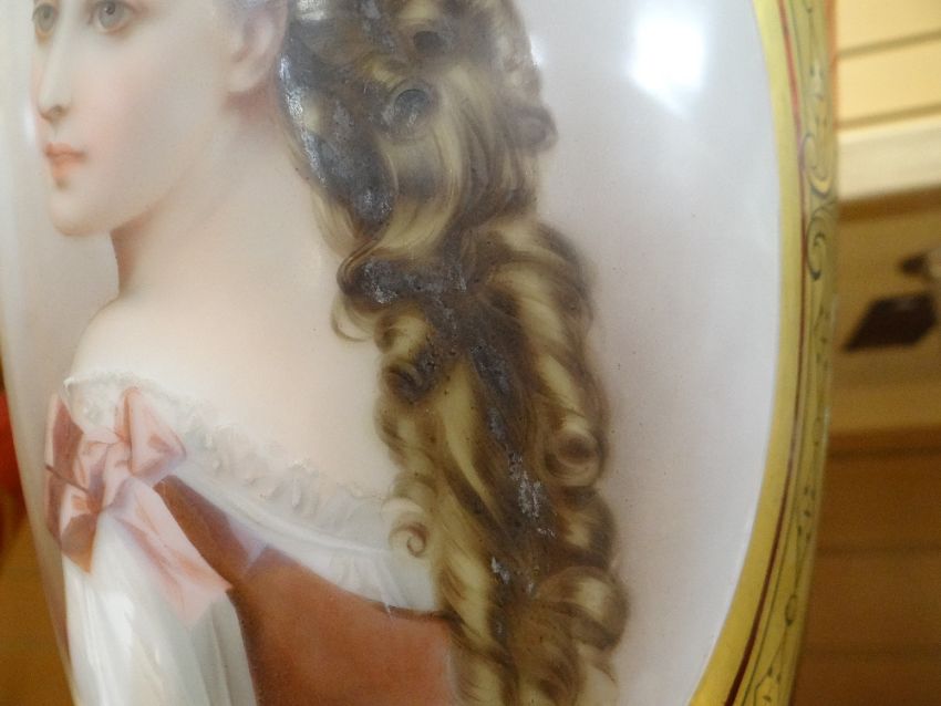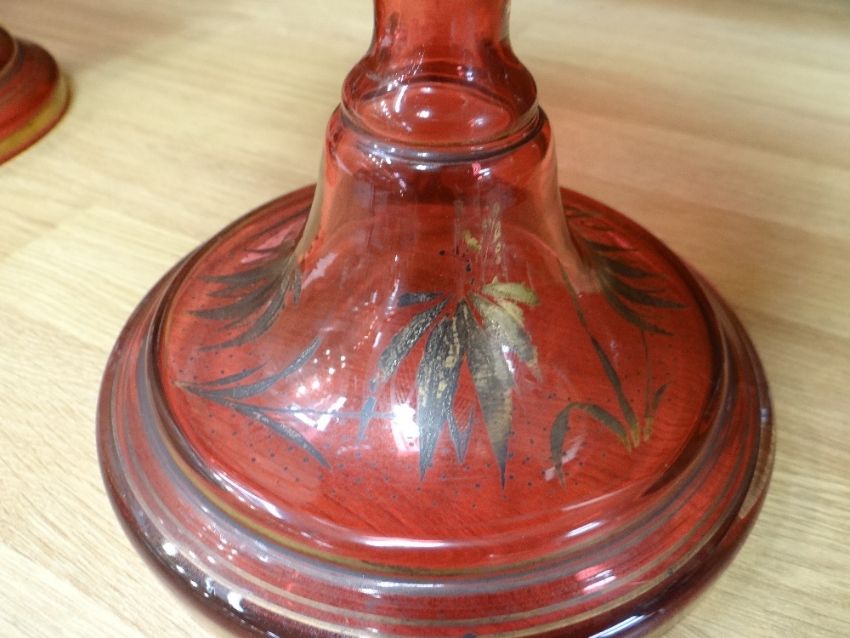 PAIR OF BOHEMIAN RUBY OVERLAY GLASS VASES of baluster form, spreading circular feet, overlaid in white with single oval panel female head and shoulder portraits to each, the ground enriched with gilt foliage, 19th Century, 49.5cms highThere are a few small chips to the top of the vases and a few at the bottom.There is a lot of gild wear to both vases.There is some slight paint issues to the hair on one of the portraits