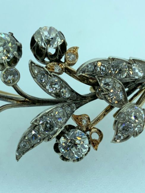 RUSSIAN 14CT YELLOW GOLD DIAMOND ENCRUSTED BROOCH, the old cut diamonds set throughout to the leaves, foliage and flowerheads. Total diamond weight of approximately 4cts. Hallmarked for St Petersburg (1899-1908) and weighing 20.4 grams overall.