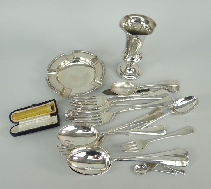 ASSORTED ENGLISH SILVER including part-set of five forks to match three dessert spoons, small campana vase, cigar tray, boxed 1934 Royal Wedding Souvenir tea-spoon, ETC 19ozs total, together with a cased set of 'Sunlight Prize' tea-spoon and tong set for Lever Bros