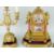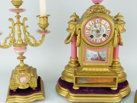 FRENCH PINK PORCELAIN & GILT METAL MANTEL CLOCK late nineteenth century of typical rococo form with pillars, urn-finial, garlands and ribbons, the circular porcelain dial with painted cherub and with vignette panel below, wooden plinths, side candelabra to match (and spare plinth), 38cms high (key with us) replacement perspex back