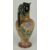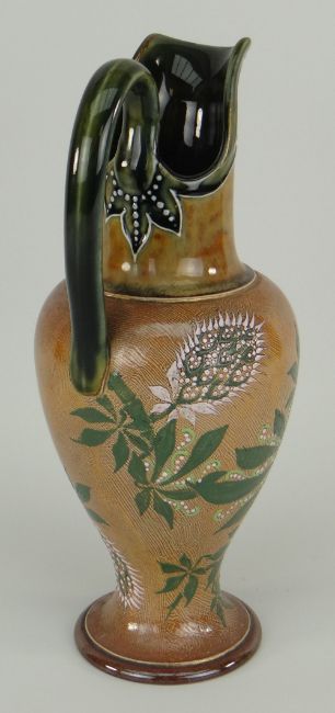 DOULTON LAMBETH & SLATERS STONEWARE EWER having elevated loop handle to a upright curved spout, painted with green and pink stylized plants to a textured ground, mottled glazed neck, 26.5cms high