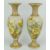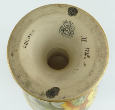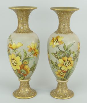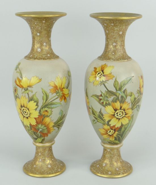 PAIR OF DOULTON LAMBETH CARRARA VASES obovoid form, flared neck and spreading foot, painted with yellow flowers, gilt decoration to necks and base, painted and impressed marks to base, 31cms high