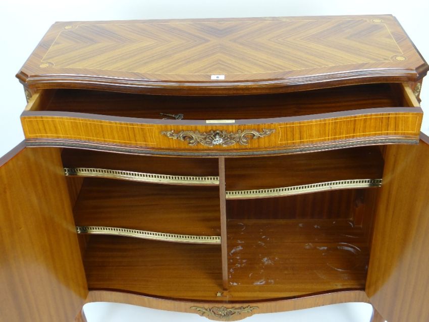 REPRODUCTION LOUIS XV STYLE SIDEBOARD of serpentine form, two door cupboard, interior shelves, single long drawer, gilt metal mounts, fine quality, circa 1950s, 101cms wide x 100cms high