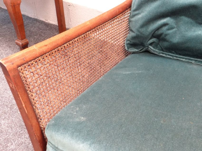 VINTAGE CANE WORK TWO-SEATER SETTEE / VINTAGE BUTTONED RED LEATHER ARMCHAIR / TWO PAIRS OF CHAIRS