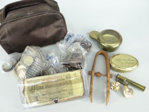 ASSORTED PRE-DECIMAL COINAGE / MINER'S TOBACCO TIN / BRASS WATCH CASE ETC