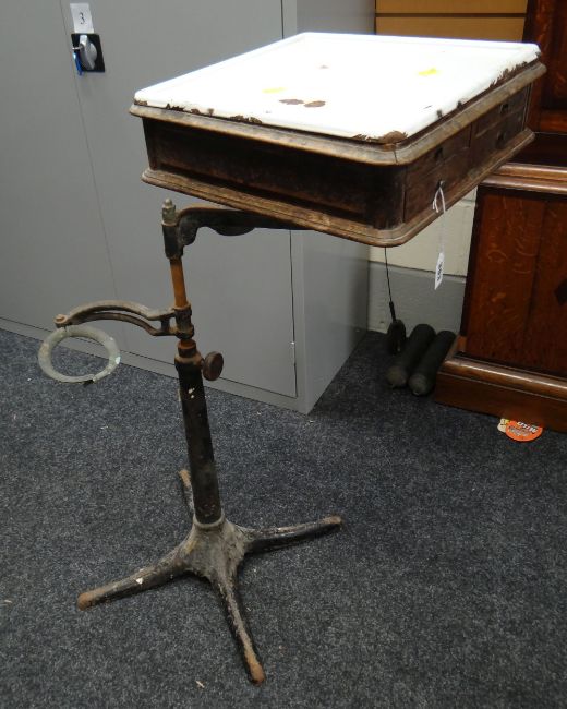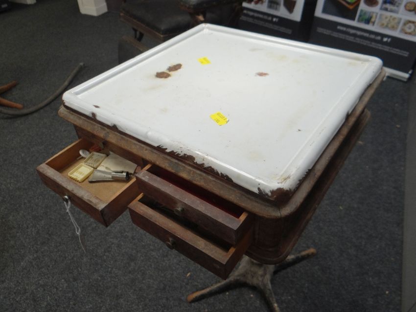 DENTIST'S BRACKET TABLE four-spoked cast iron base, white enamel top, four small drawers