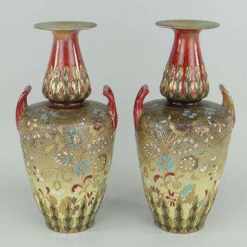 PAIR OF DOULTON LAMBETH & SLATERS TWIN-HANDLED VASES having baluster bodies, tapered and flared necks, elevated loop handles, floral lacework bodies with gilding, mottled red glaze to neck and handles, 27.5cms high