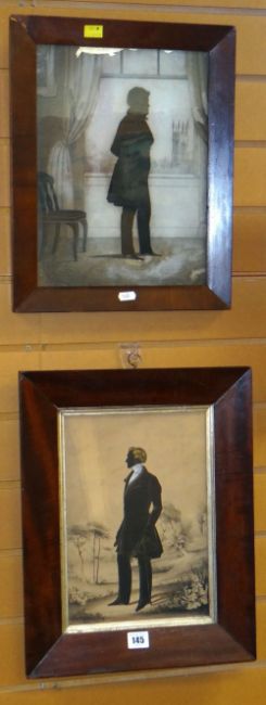TWO LATE 18TH / EARLY 19TH CENTURY FRAMED SILHOUETTES OF STANDING VICTORIAN GENTLEMEN, 34 x 25cms and 31 x 21cms