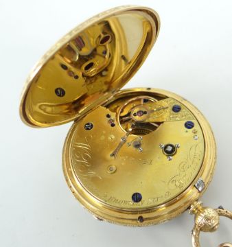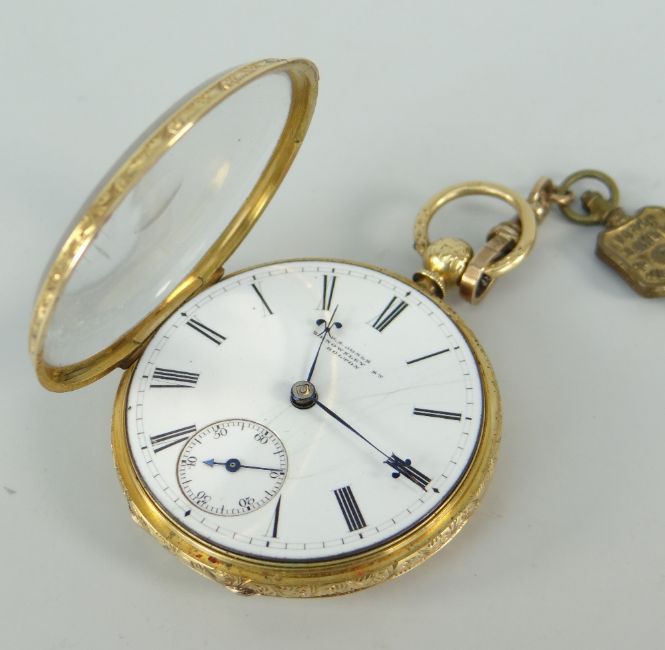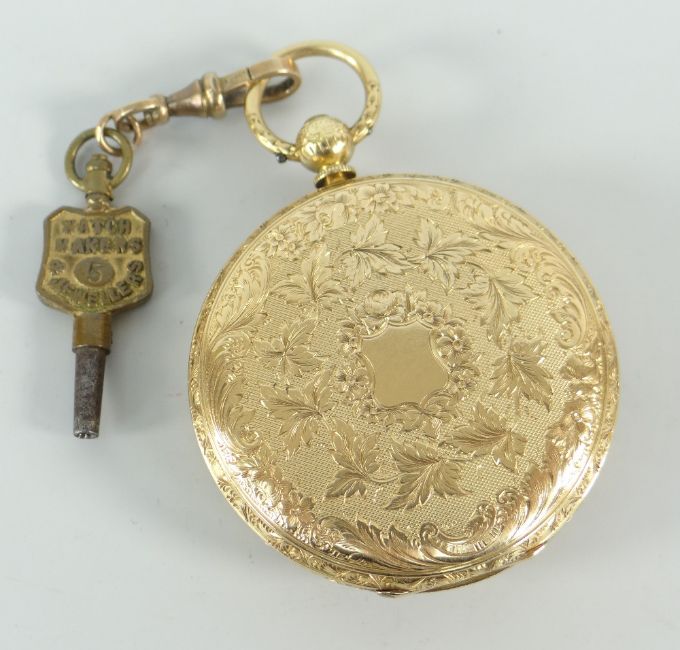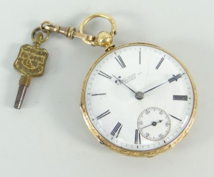 CASED 18CT YELLOW GOLD OPEN-FACE POCKET-WATCH bearing Roman numerals to white enamel dial bearing W S Jones, Knowsley St, Bolton, key-wind and key attached, foliate engraved case, Chester 1870, 72gms
