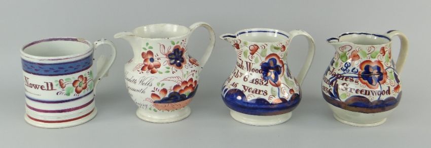 FOUR ITEMS OF 19TH CENTURY WELSH POTTERY WITH INSCRIPTIONS including three Gaudy Welsh jugs inscribed James Hannah Greenway 1836, Goerge Charlotte Wells, Great Yarmouth, Love and Live Happy 1853' 'Susannah Wood Died Feb...', together with a cylindrical tankard with name inscribed