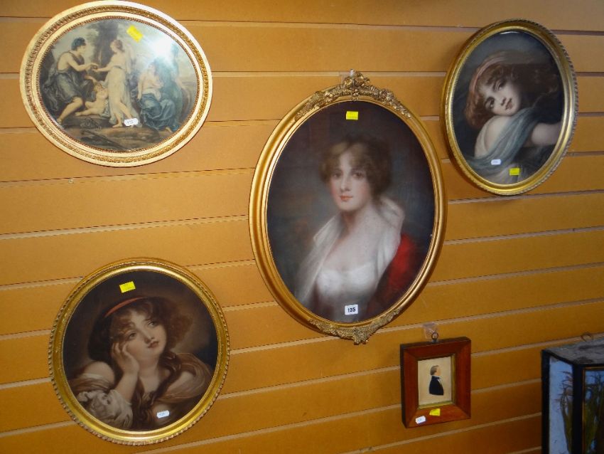 19TH CENTURY ENGLISH SCHOOL believed watercolour - head and shoulders portrait of a female, 50 x 40cms, together with three gilt frame oval prints and small framed caricature of a Victorian male with embossed stamp to lower left, 11.5 x 8.5cms