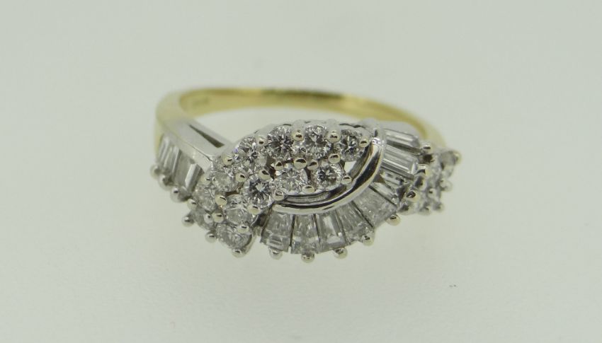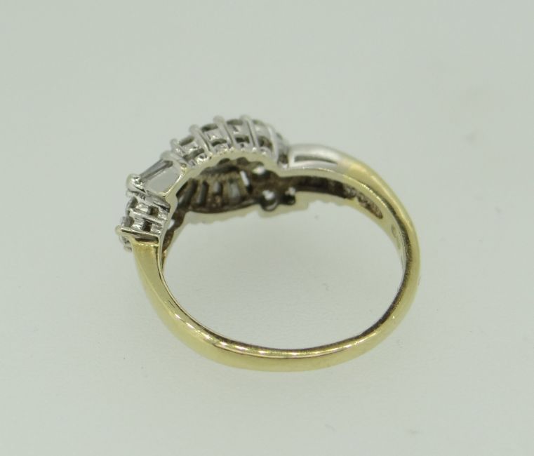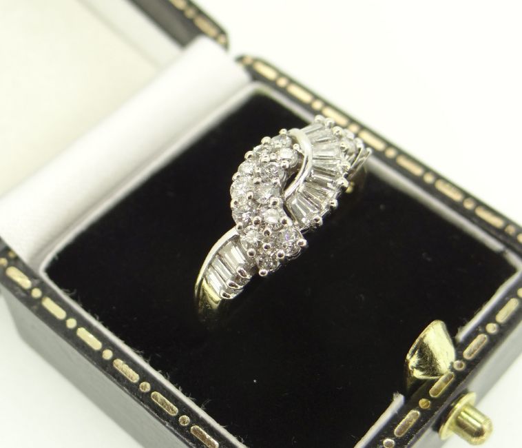 18CT YELLOW GOLD SET DIAMOND CLUSTER CROSS-OVER RING with baton and round diamond combination, approx 27 stones total