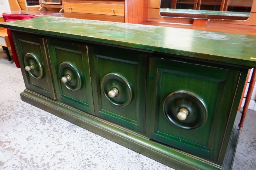 UNUSUAL PAINTED GREEN FOUR CUPBOARD DOOR BASE SIDEBOARD