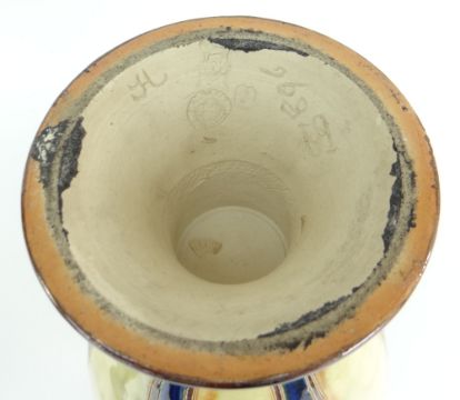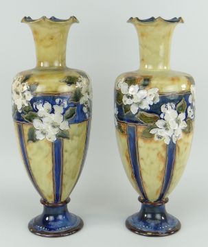 PAIR OF ROYAL DOULTON STONEWARE VASES of obovoid form, narrow necked with crimped rim, spreading feet, tube-line decorated with white flowers to a mottled glaze by Eliza Simmance, 39cms high
