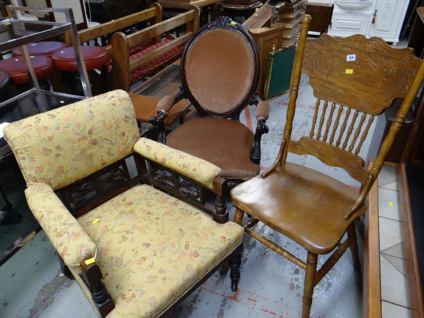TWO EARLY 20TH CENTURY ARMCHAIRS together with a later carved high-back kitchen chair
