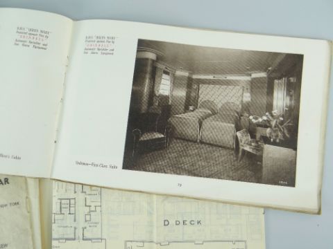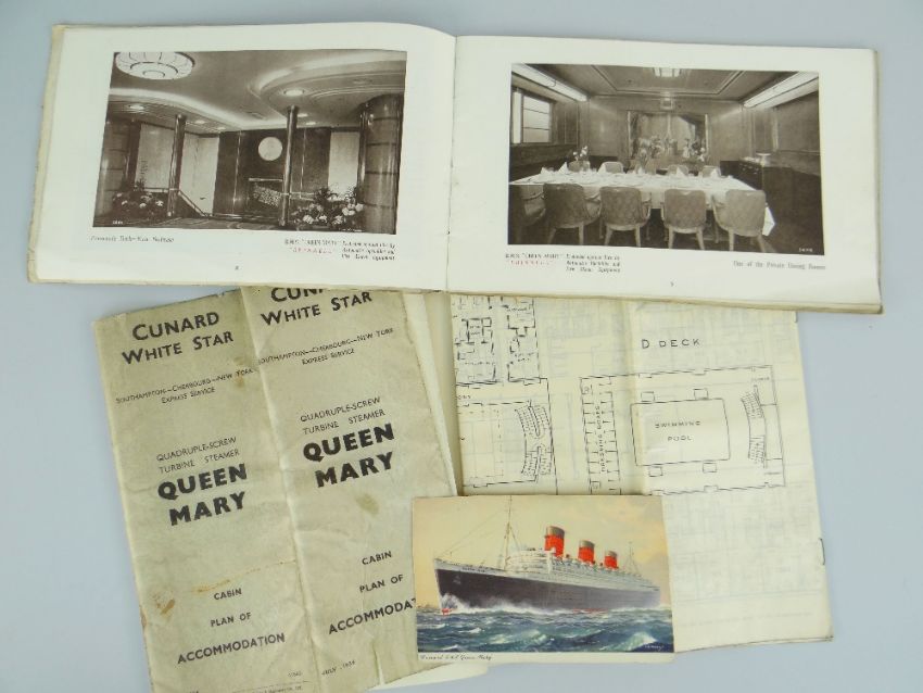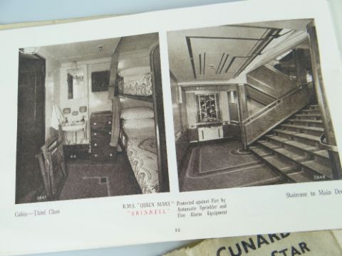 CUNARD WHITE STAR LINE QUEEN MARY EPHEMERA comprising 1936 Cabin Plan of Accommodation, sales-booklet for the on-board fire alarm and sprinkler system by Grinnell Automatic, and a postcard for the vessel (3)