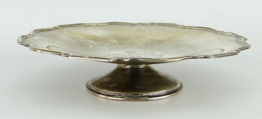 GEORGE VI SILVER PRESENTATION PEDESTAL COMPORT having pie crust rim and engraved 'To Mrs Jordon wishing you a very happy retirement...', Birmingham 1939, 11 troy ounces approximately.