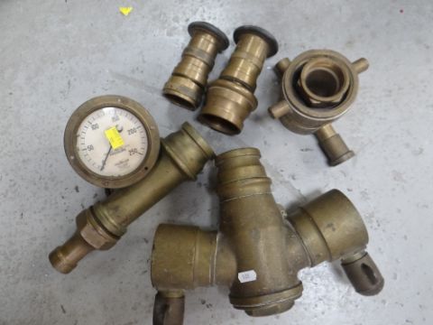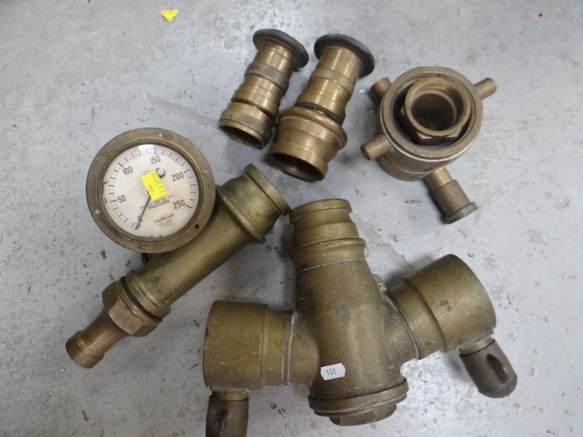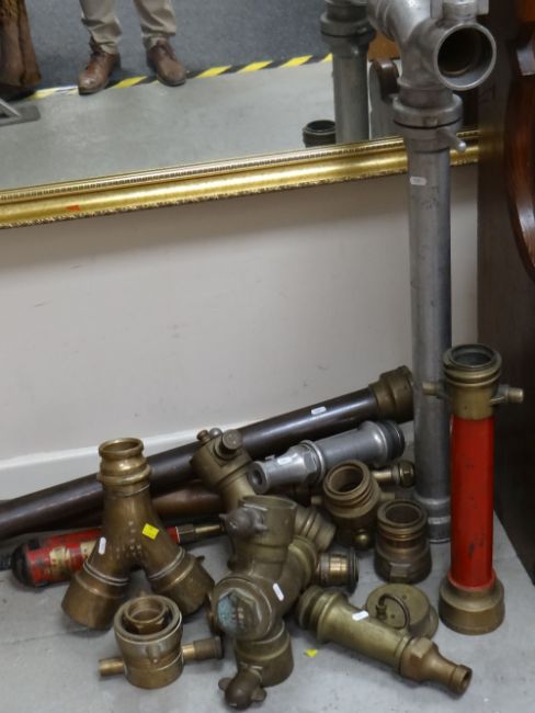 COLLECTION OF FIRE SERVICE HEAVY BRASS HOSE SECTIONS together with a vintage fire extinguisher and other associated parts