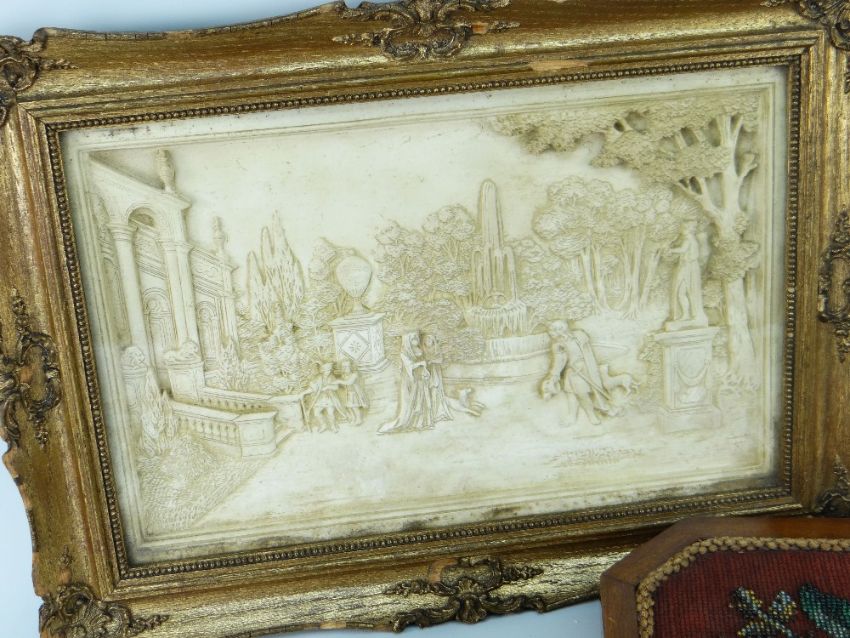 TWO VICTORIAN BEAD WORK STANDS together with carved chalk work picture depicting figures in a courtyard, together with florally decorated oval box and cover (4)