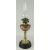 ANTIQUE OIL LAMP WITH ART NOUVEAU STYLE BRASS STEM, circular black glass base, copper reservoir and etched glass globular shade, 62cms high