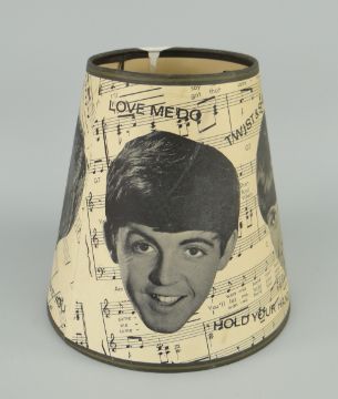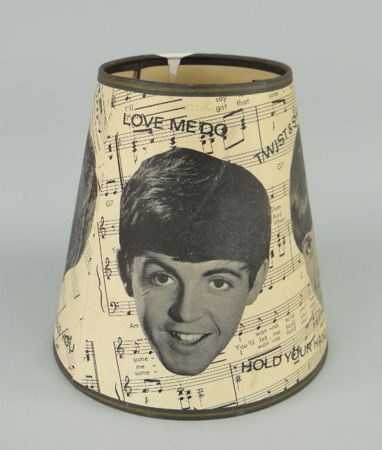 ORIGINAL 1960'S 'THE BEATLES' TABLE LAMP SHADE, featuring portraits of each band member over music scores and various hits, 16.5cms high