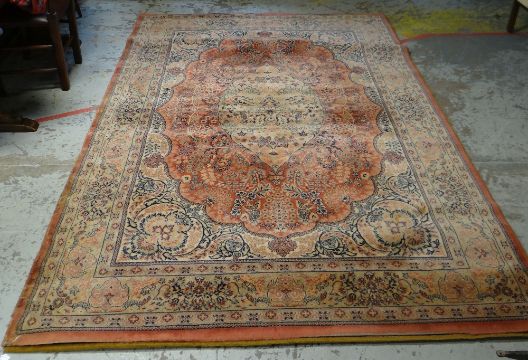 MAINLY GOLD & BLACK GROUND PERSIAN STYLE RUG with centre decoration and urn and flower decorated border, 298 x 199cms, together with a similar sized pale red Persian woolen carpet with floral decoration to centre and similar to border, some wear to the edging