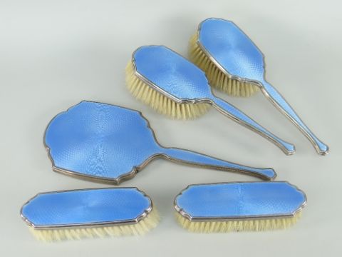 SILVER & GUILLOCHE BLUE ENAMEL FIVE-PIECE VANITY SET comprising pair of hairbrushes, pair of clothes-brushes and mirror, London 1932