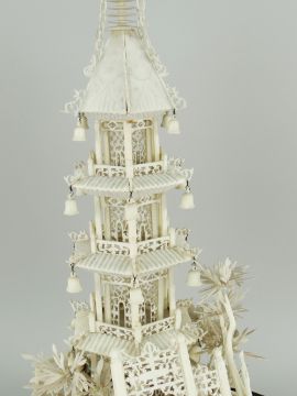MEIJI PERIOD JAPANESE IVORY MODEL OF A PAGODA BUILDING under a glass dome on wooden base with painted figures, dome size 47cms high
