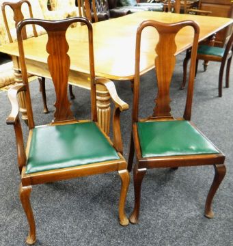 VICTORIAN MAHOGANY EXTENDING DINING TABLE on reeded and turned supports with casters, to accommodate six leaves in total, and six non-matching splat-back chairs, 332 x 135cms extended