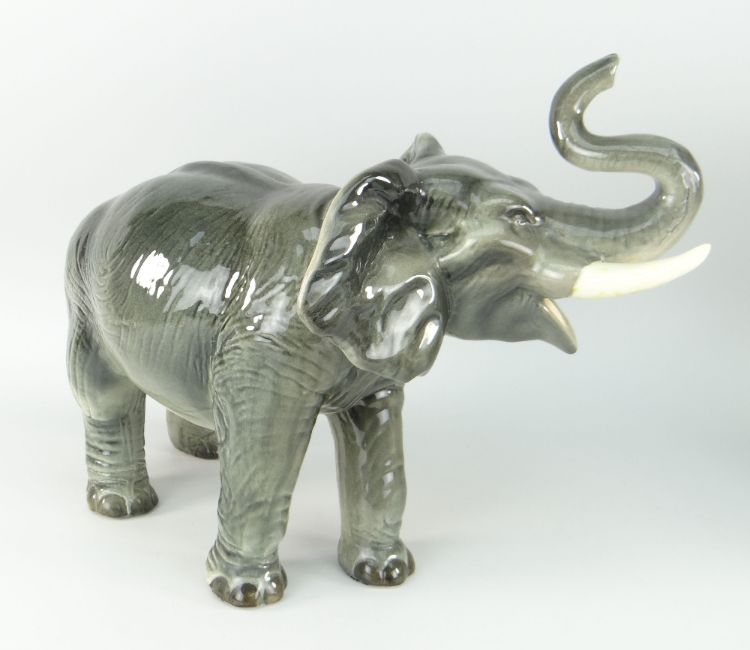 NAO MODEL OF A GIRL ON A BENCH FEEDING DOVES, together with a Melba ware pottery elephant model