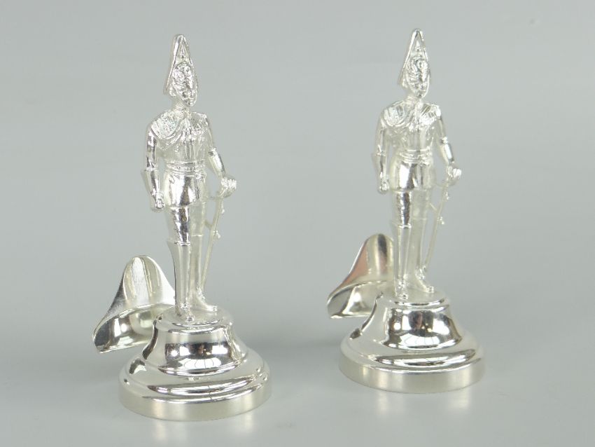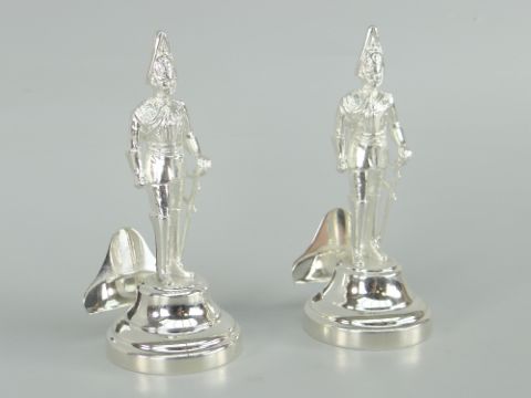 SET OF FOUR SILVER MENU HOLDERS IN THE FORM OF QUEENS HORSE GUARDS each standing on bell-shaped bases, maker's mark E&J, London 1973, 10ozs total