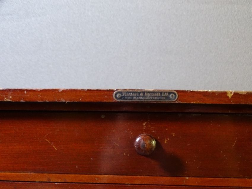 SIX DRAWER STAINED PINE COLLECTORS' CHEST with 'Flatters and Garnett Limited, Manchester' label containing a good unsorted quantity of British vintage postage stamps, 41cms height, 38cms width, 23cms depth