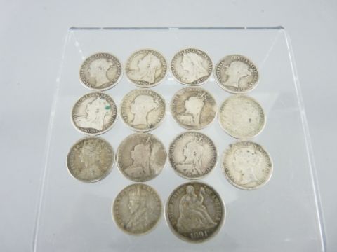 ELEVEN SILVER THREE PENCE PIECES, Victorian to early 1900s, an 1891 US dime and an Indian two Anna piece, 0.6 troy ozs
